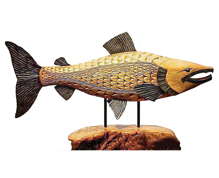 While hunting down materials for his next carving, Richard Shaw came across one of his childhood toys—an old metal steam engine. After taking the train apart, Richard decided to repurpose the steel pieces into fins, gills, an eye, and a mouth for what would soon become a yellow cedar salmon.