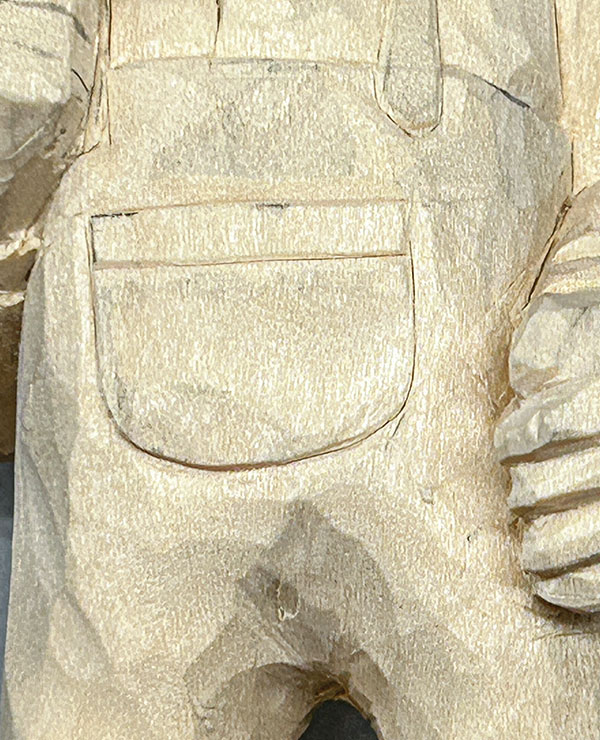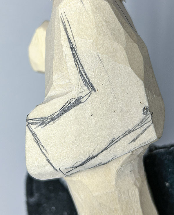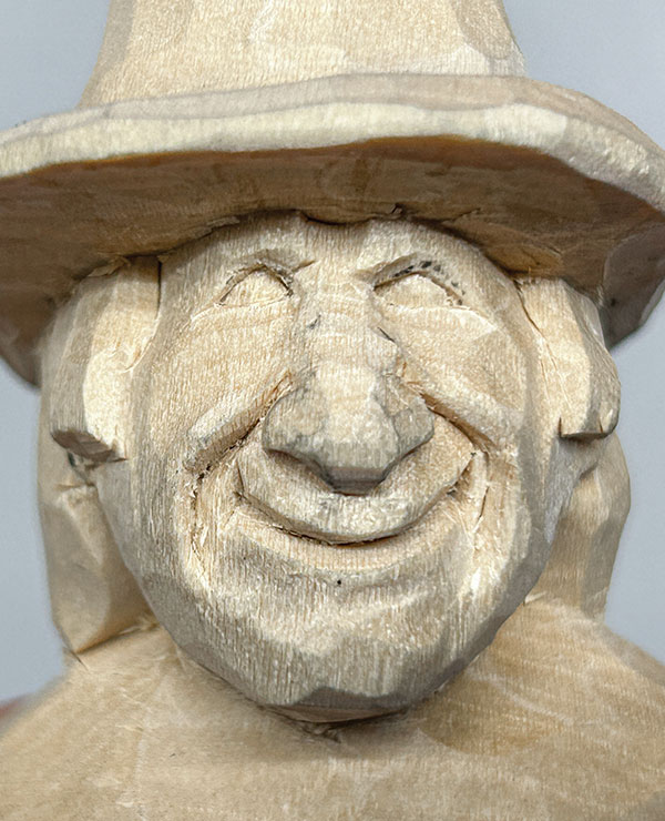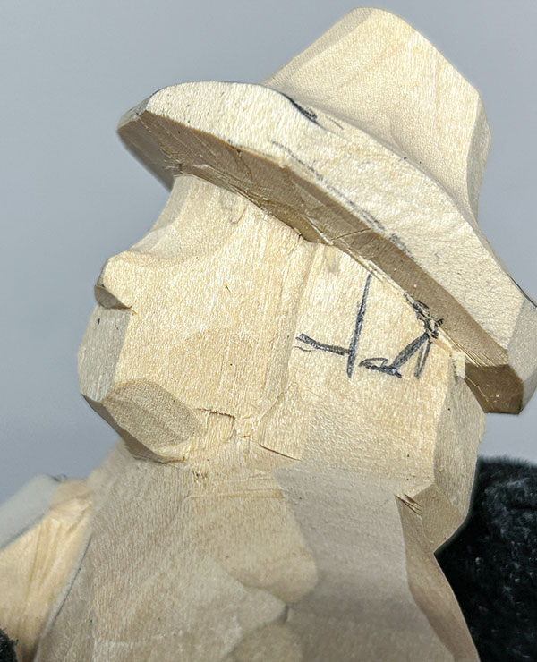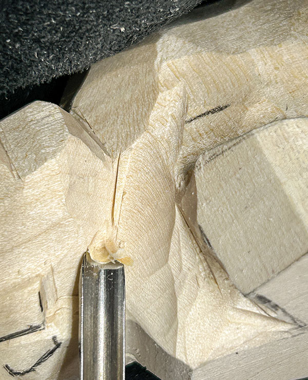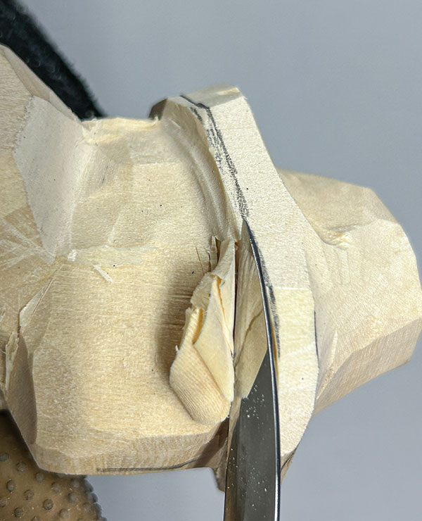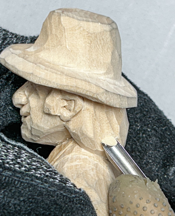 Step 3Block in the head. Use the carving knife and 5/8″ (16mm) soft V-tool to start blocking in the face and hat. I like to work on these at the same time. |