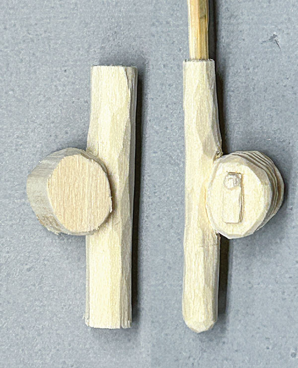 MATERIALS • Wood, such as basswood, 2-1/2″ (6.4cm) square: fisherman, 6″ (15.2cm) long • Wood, such as basswood, 3/8″ (1cm) square: fish, 1-3/8″ (3.5cm) long • Wood, such as basswood, 3/8″ (1cm) square: reel, 1-3/4″ (4.4cm) long • Bamboo skewer: fishing pole, 3-1/4″ (8.3cm) long • Marker: black • Acrylic paint, such as Americana®: black, burnt sienna, dark forest, light buttermilk, tomato red, uniform blue; such as Anita’s™: chocolate brown; such as Ceramcoat®: coral, leaf green, medium flesh, silver, yellow ochre • Boiled linseed oil • Mineral spirits • Finish, such as spray lacquer • Glue: cyanoacrylate (CA), wood • Cord or string |