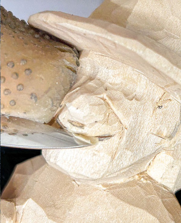 Step 8Add head details. Carve the ears and sideburns. Then use the 1/4″ (6mm) #9 gouge to carve the hair. |