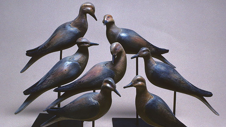 While Bob’s early interest in woodcarving reflects his passion for antique hunting decoys, his work has evolved to cover a wide range of subjects, from the dramatic to the whimsical. In his studio overlooking Hunting Creek you will see a carving of a peregrine falcon with a dying shorebird in its talons. You also will find a carving of a cow jumping over the moon, a carved cat with moving joints sitting on the edge of a shelf, and several carvings of dragons.