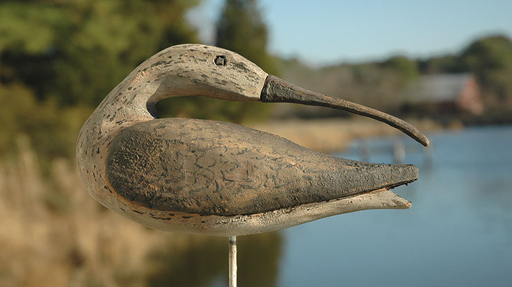 Bob studied with the noted decoy-maker Mark McNair, who uses fire as part of an aging process, and Bob adapts the process for his own work. “Mark uses fire on a very limited basis in his work, but I use it extensively,” Bob said. “I burn the raw carving with stained mineral spirits to provide a base color of aged wood. And then I burn the oil paint as I apply it to darken and enrich the color. Finally, I scrub the carving with soap and water, and that removes any burn residue and thins the paint enough to let some of the aged wood show through.”