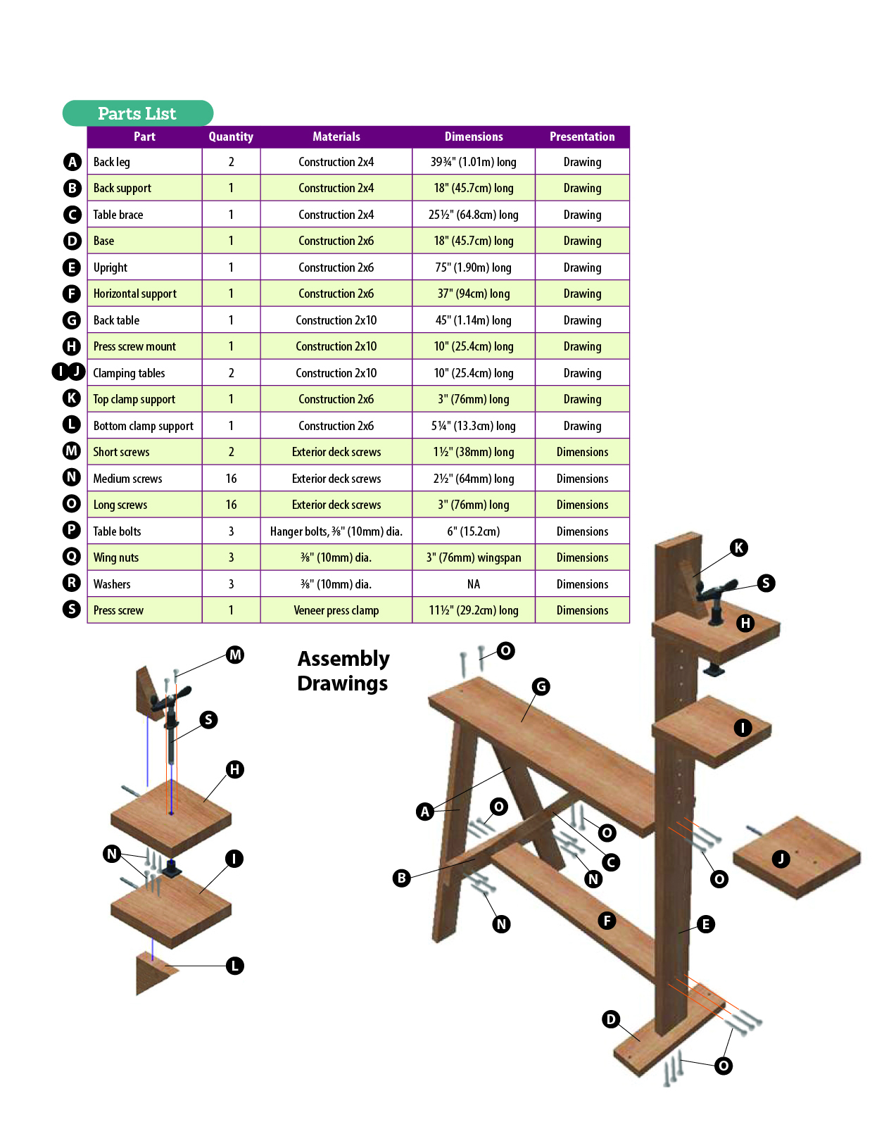 Assembling the FrameUse the assembly drawings as guides to assemble the stand. Drive the table bolts (P) about 3 1/2″ (89mm) into the edge of the press screw mount (H) and clamping tables (I, J) (see Tip). To make it easy to drive the screws at an angle through the table brace (C) into the back table (G), drill pilot holes slightly smaller than the diameter of the screws. Follow the manufacturer’s instructions to mount the press screw. |