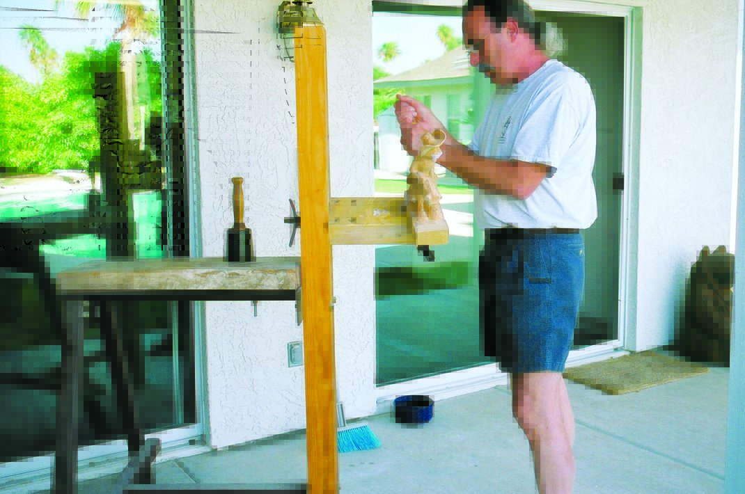 Shop-made holding fixture allows you to carve anything outdoors