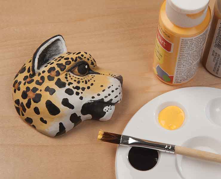 MATERIALS • Basswood or butternut, 7/8″ (2.2cm) thick: 3″ x 4″ (7.6cm x 10.2cm) • Acrylic paint, such as Plaid Apple Barrel: black, white, khaki, apricot, golden brown, nutmeg brown, pink; black panther only: charcoal gray • Danish oil (optional) • Stain: walnut (optional) |