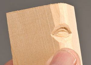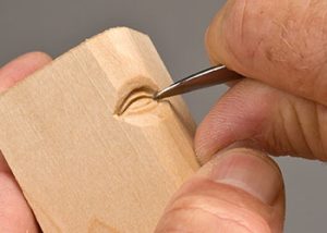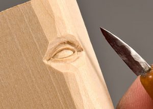Step 3: Rough in the eyeball. Remove a triangular chip of wood from the inside and outside corners of the eye with a carving knife. This helps you begin to round the eyeball. Step 4: Carve the upper eyelid. Make the first V-tool cut along the inside crease of the top eyelid. Use a sharp 1/8″ (3mm) V-tool. This separates the upper eyelid from the eye socket and the brow line.