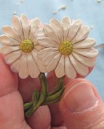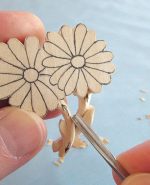 5. Burn along each petal. Use a skew tip with the woodburner set at a low temperature. Add a few marks to the stem and around the leaves. Paint the petals with several thin washes of white. Do not cover the woodburned details. Paint the flower centers with a thin wash of green paint. When dry, paint the circles with slightly thinned yellow paint. Drybrush a little yellow on the stems as a highlight. Use craft glue to attach the pin back to the back of the flowers. When the paint is dry, wipe on some Meltonian Shoe Cream, allow it to dry, and buff it with a soft cloth. |