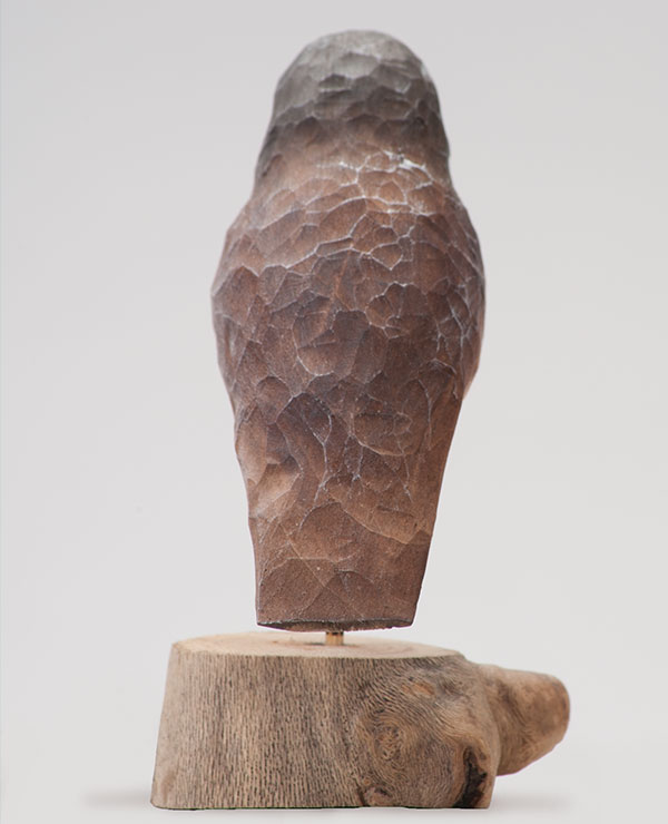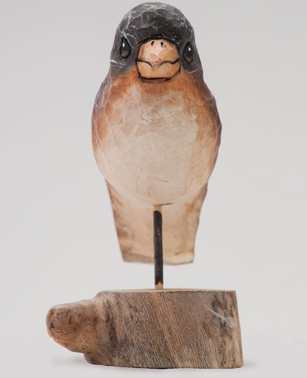 Transfer the pattern to the blank and cut the two profiles with a band saw. Leave the wood thick around the beak. Then, carefully round the sharp corners with a knife. Thin the edges of the tail, but leave the middle thicker to create an oval shape when looking at the end. Carve the eye channels. Then, carve the beak. Burn the outlines of the eyes, around the base of the beak, and the mouth lines. Drill a small hole in the bottom and insert a toothpick (to mount the bird to the base, and to hold the bird while painting).