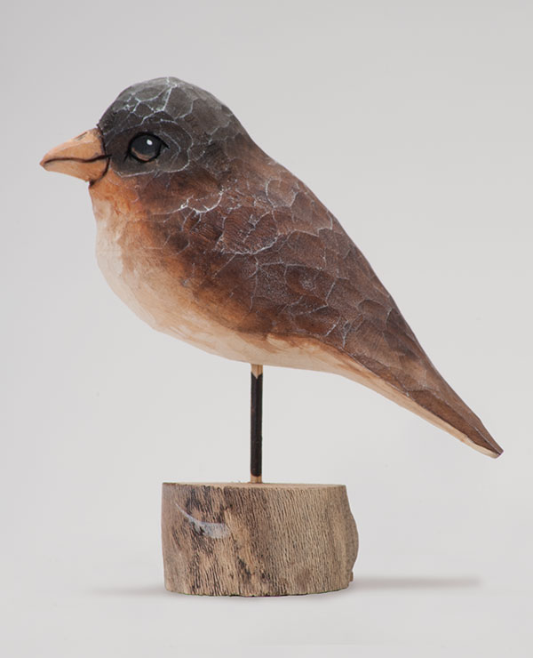 Slice a small section of a tree limb across the grain. Drill a hole matching the diameter of the toothpick in the center of the slice. Apply a clear finish to the base. When it is dry, glue a toothpick into the bottom of the bird and the hole in the base.
