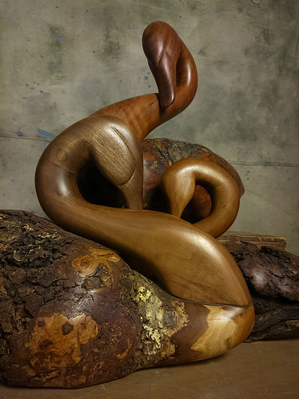 Chris personally selects the wood for his sculptures, most often choosing cedar, pine, and various hardwoods from the lush forests of North Carolina. “I like to explore the variety of different woods and have found that using older wood gives the work more character,” said the 53-year-old artist. “I also look for wood with heavy bark, lichen, moss, knots or knot holes, etc., as these are all signs of potential character. I love cutting into the wood and uncovering the characteristics and beauty each tree hides.”