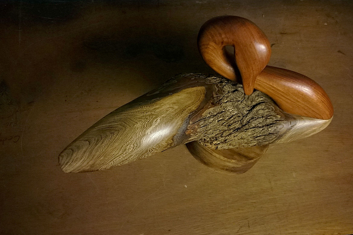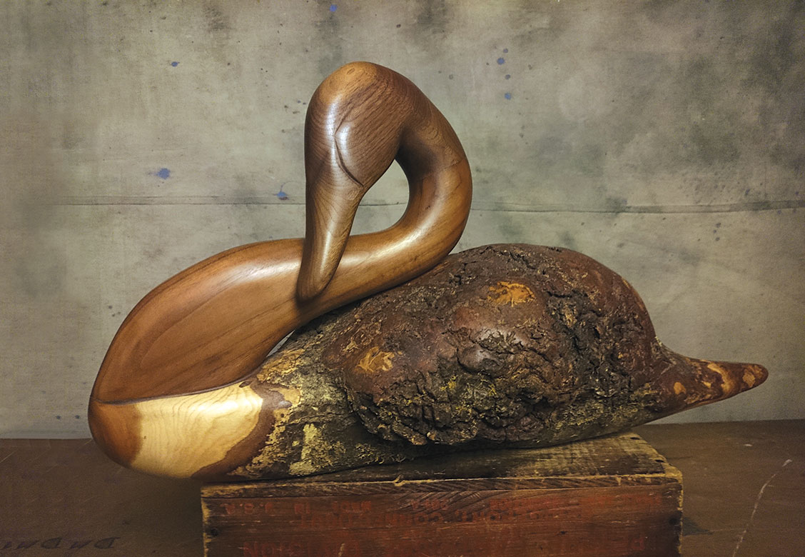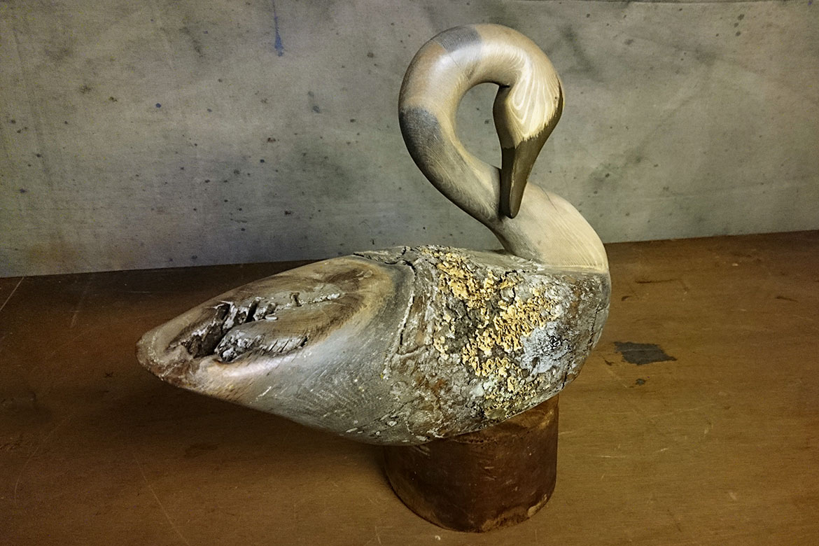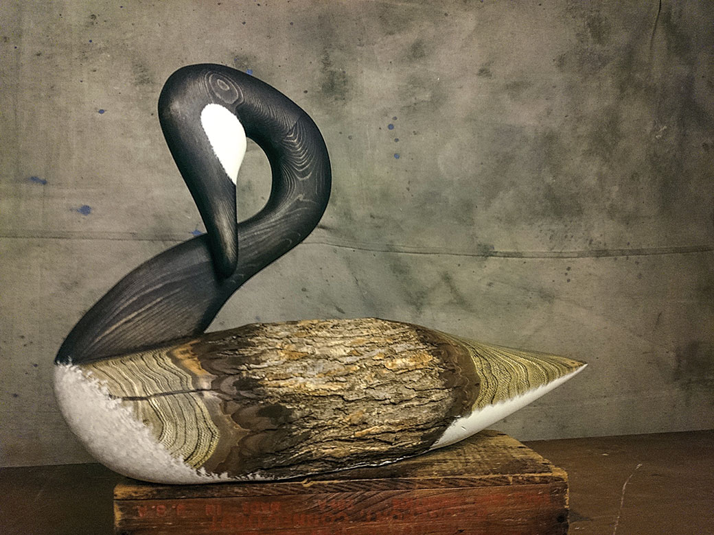 Chris Boone uses natural bark, knots, and lichen to accent his carved decoys