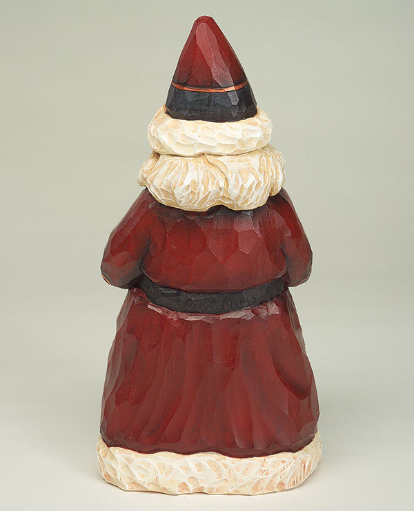 This Happy Santa captures the essence of Jolly Old St. Nicholas. He has a straight-forward gaze, symmetrical pose, and his hands are tucked warmly into mittens, which makes this a great project for beginners. I’ve given him a simple coat and undergarment free of embellishments. Any extra decorative painting can be easily incorporated into the banded areas on the sleeves and hat. Simple textures and a basic paint scheme are easily reproduced, but combine to make a pleasant Santa full of holiday cheer. You may reduce or enlarge the pattern to suit the dimensions of your wood. Carve the Santa, using your tools of choice. To carve the Santa easier, attach your blank to a carver’s arm to have better control while carving.