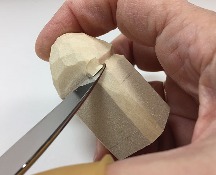 1. Block in the hat. Use a knife of your choice. Carve off all four corner edges from the bottom to top of the block. Starting at the upper scarf line, round and shape the hat by carving up at an angle toward the top of the block.
