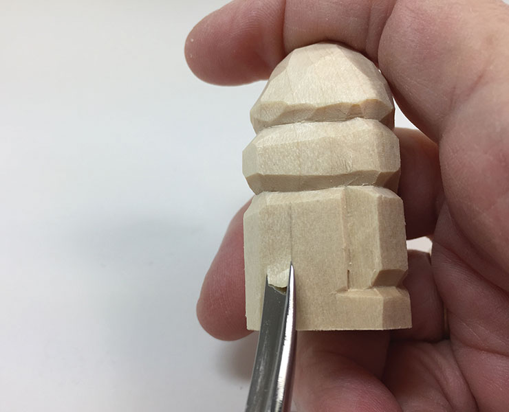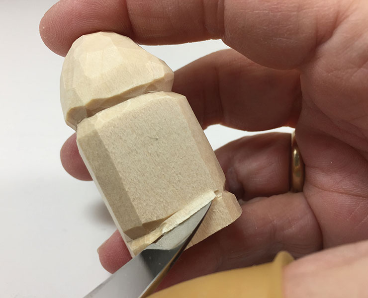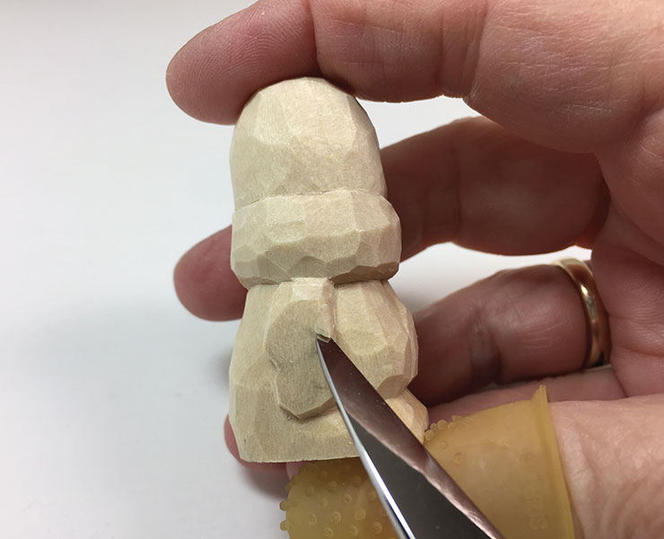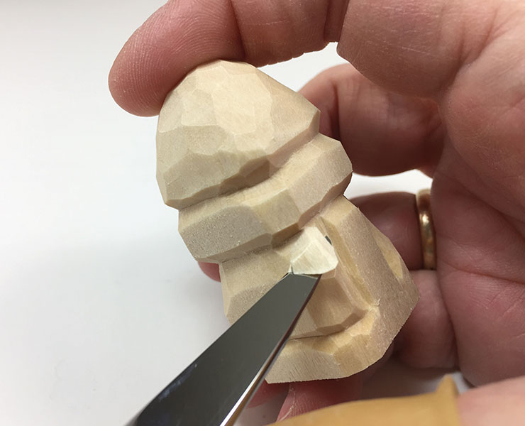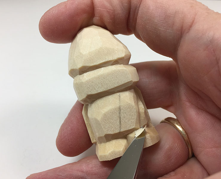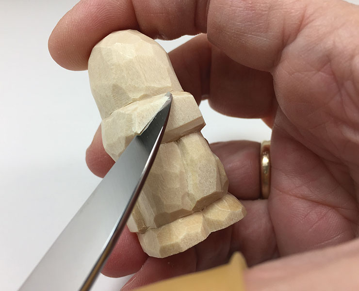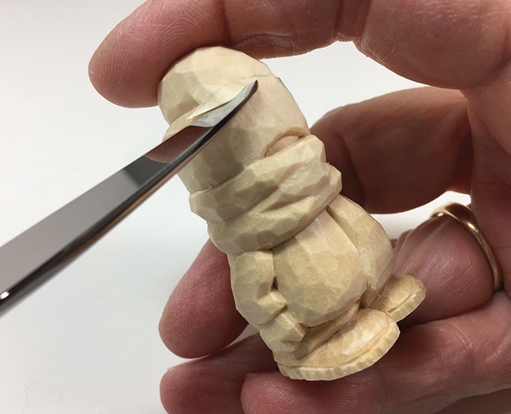 13. Add final details. Use the knife to undercut the arms, scarf, and pom-pom. A thin sliver of wood is removed from all these areas to add the appearance of depth and roundness. Cut along the edge of the feature, and then cut at a tiny angle just above or below the first cut to remove the sliver of wood.