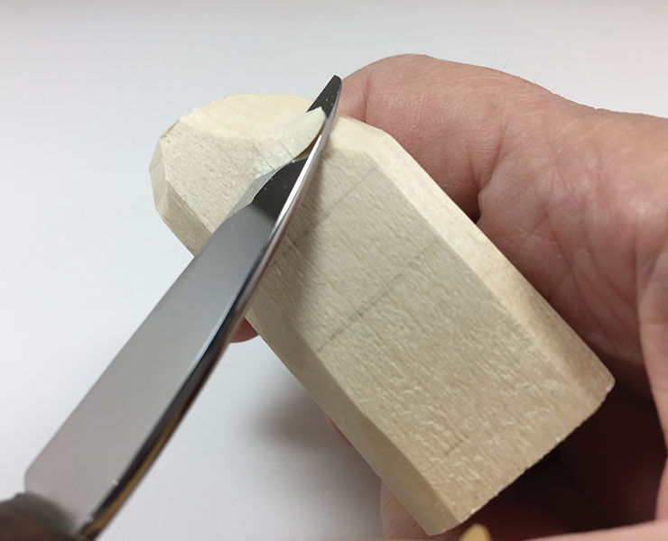 Transfer the patterns to the block with graphite paper and a pencil or sketch them by hand. Note: Always wear a carving glove and thumb guard. The photos were taken without them to clearly show hand and knife positions.