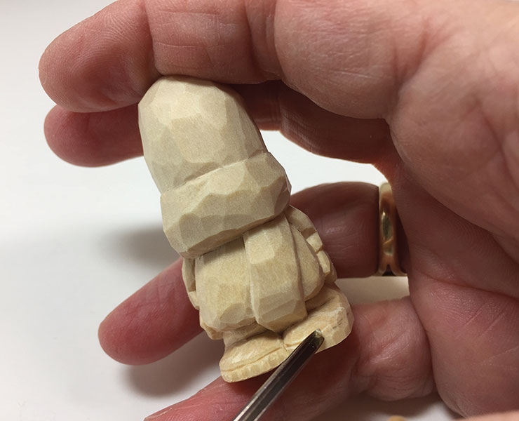 10. Carve the coat and boots. Draw a line for the bottom of the coat. Using the knife, stop-cut the line. Shape the back of boots, carving from the bottom of the boots up and in to the stop cut. In front, shape the top of the boot by cutting straight back toward the leg. Round over the bottom edge of the coat. Draw a line for the sole of the boot, and then cut the line with a 1/16″ (2mm) 90° V-tool. Use a 1/16″ (2mm) micro gouge to cut in a Vibram sole for the boot.