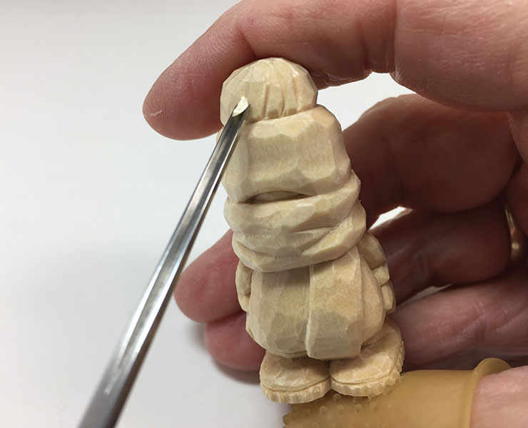 12. Finish the hat. Use the knife to create hat texture. Carve facets using a sweeping or rolling motion with the knife blade all around the hat. Use the 1/16″ (2mm) 90° V-tool to create the texture for the pom-pom. Draw a series of swirling lines meeting at the top. Then carve in the lines with the V-tool.