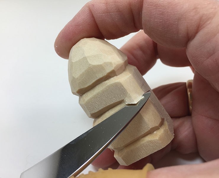 2. Rough out the scarf. Using the knife, make V cuts on the upper scarf line. Two cuts are made, one angling down and the other up and in, to form the V shape that meets at the upper scarf line.