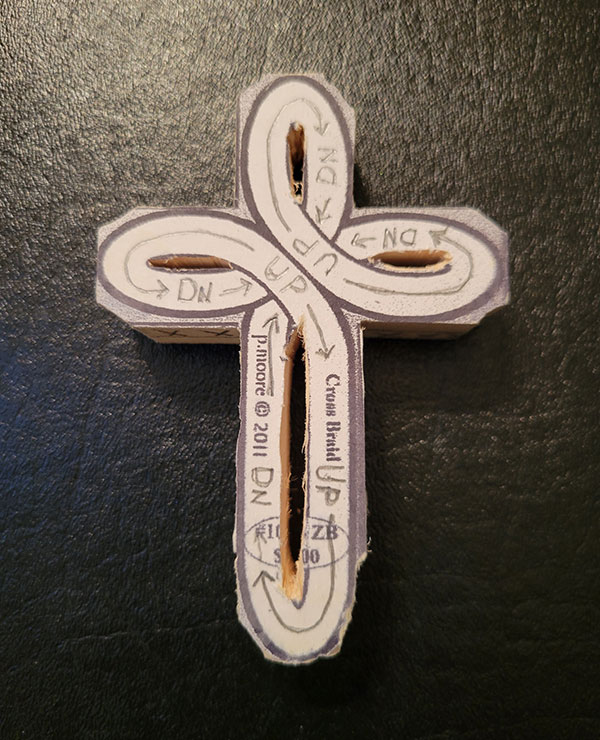 Sanding and FinishingSand the cross; I used Abranet sanding mesh in assorted grits up to 320 that I cut into thin strips about 3/16″ (5mm) wide and 3″ (7.6cm) long. Alternatively, you can use sandpaper in assorted grits. Loop the 80-grit sanding mesh strip or sandpaper around the individual braid and sand in a back-and-forth motion along the braid’s length and end loops. Use this sanding technique to smooth out the area where the braids intersect in the middle of the cross. Do not rush this process. Continue sanding through the other grits until you reach 320. After sanding, use a digital caliper to measure the braid. The braid should have a final diameter of about 5/16″ (8mm). Remove excess dust and dirt from the cross and apply three to four coats of a wax finish such as Howard Feed-N-Wax®. Then saturate narrow strips of a cloth with the finish and loop it around the braids to apply the wax in narrow areas. Let sit for 20 minutes and wipe off excess finish. Then polish the cross with a clean, soft cloth. |