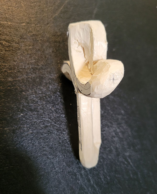 CarvingMake a stop cut around the perimeter of the top and bottom sides of the blank using a carving knife. Follow the outside lines on the cross pattern. Then make a stop cut along the side profile centerlines. Start shaping the cross by removing areas marked with “X”s on the side profile with the carving knife or gouges of your choice. Be mindful of the grain direction as your tools could sever the braids or remove too much wood that would severely diminish the symmetrical shape and diameter of the braids. Round the inside and outside of the individual braids with the carving knife and gouges; I used a 3/16″ (5mm) micro gouge from the inside of the four loops to maintain an equal braid diameter. Then use a detail knife to separate the braids where they meet in the middle and on the side profile. Aim for the cross braids to be about 3/8″ (10mm) in width. |