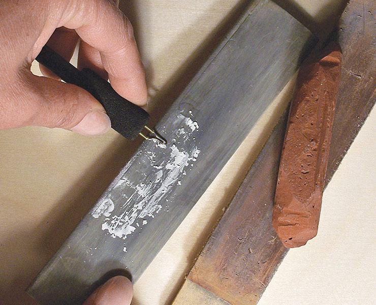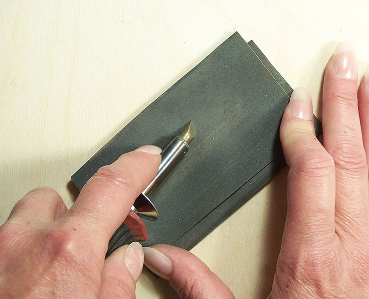 Use fine-grade sandpaper or emery cloth to keep a soldering iron-type tool’s solid brass tip bright and clean. The paper used here is 400-grit emery cloth. |