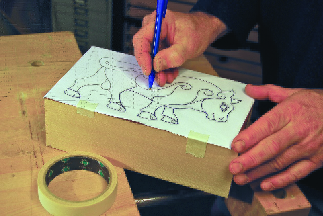Frosting is a method to add texture to the background of a relief carving. With very little effort, we can make the design stand out and move from a simple line drawing to a sort of relief. A “froster” or “frosting tool” (also called a “matting tool”) is a metal punch, the end of which looks like a meat tenderizing mallet with lots of little square pyramidal teeth. You can buy such punches from woodcarving suppliers or make them yourself from a bolt and triangular file. The most common froster has a square grid of 16 teeth, but you can buy or make frosters with fewer teeth to fit into smaller areas. You can frost the background randomly or side to side like a plowed field. I prefer to make the frosting “work,” producing its own pattern. Transfer your drawing to an unvarnished piece of wood, and carve the whole bull again, exactly as you did the first time.