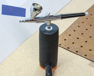 The compressor pump provides a stable base for the airbrush to stand upright.