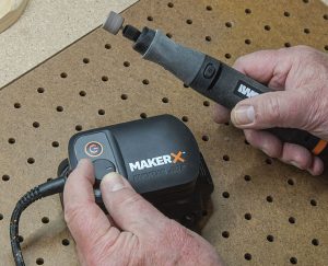 This was one of the first thoughts that hit us when we examined the MakerX rotary tool and its amazingly portable-power hub: now, power carvers can have the same freedom as hand carvers do.