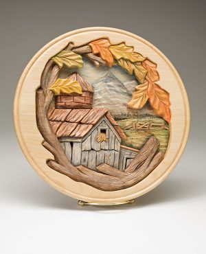 There are three main levels in this design consisting of the background, the barn, and the limbs and leaves in the foreground. However, as with a carving depicting a face, areas within any given level are carved to different depths to create the proper perspective. If a face is turned to one side, the side farthest from the viewer will be deeper than the other side. The back side of the barn and roof, where the shed is attached, is deeper than the front side.