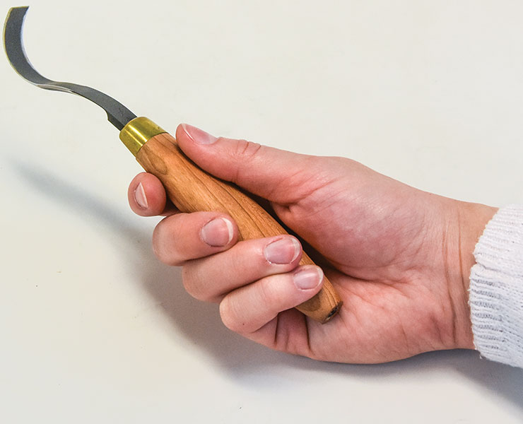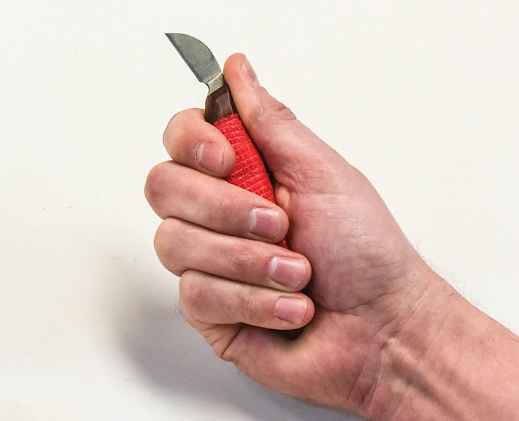 Bench KnivesThe tool we call a bench knife comes in many shapes and sizes. Some have long blades that may extend up to 4″ (102mm) from the handle, while others, such as chip-carving knives, have a 1″ (25mm)-long blade. Some blades have straight cutting edges, while others start to curve along the top third of the blade. Some are sharpened on one side only while others are sharpened on both. And each will fit your hand differently. While many wood carvers have a variety of bench knives in their kits, most return over and over again to just one or two favorite tools. Following are the two main factors to consider. |