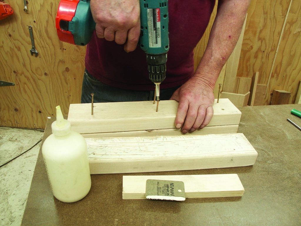 1. Glue together two 18″ lengths of 2 x 4. Drill six 5⁄32″-diameter pilot holes in one, and screw it to another with 21⁄2″-long drywall screws after spreading one with carpenters’ glue. Clamps may be used, but the drywall screws will prevent the 2 x 4s from sliding all over each other as the clamps are positioned and tightened. Turn the assembly over, and screw and glue a third 18″-long 2 x 4 to the other side. Wipe away any squeeze-out with a damp cloth. Once the glue has set—about 30-minutes—remove the 12 screws. This assembly will permit you to carve subjects as large as about 8″ in diameter. If you feel that you will be carving larger subjects, add another 2 x 4 or two.