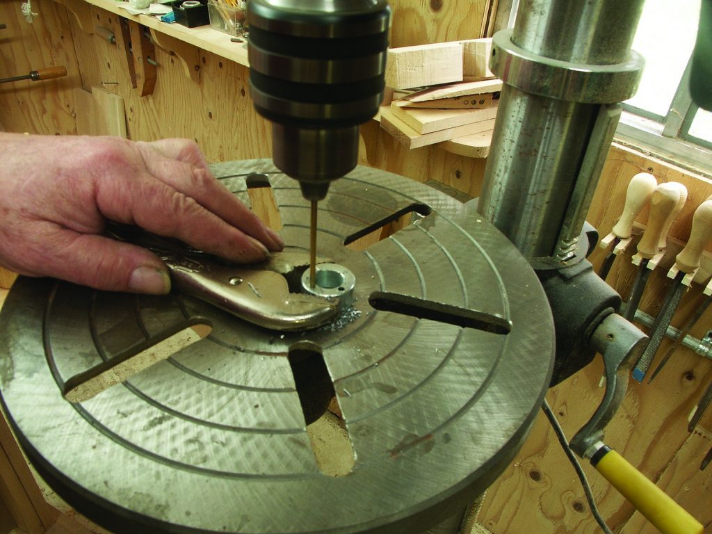 3. Prepare the spur center. Carefully lay out and drill four 1⁄8″-diameter holes, at 90° intervals around a 5⁄8″-diameter shaft collar. Be sure to avoid the set screw. The holes should go almost, but not totally, through the shaft collar.