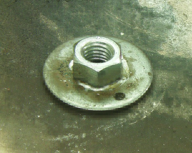 6. Prepare the point-bearing lock. Set a 1⁄2″-diameter nut over a 5⁄8″-diameter washer with two 1⁄8″-diameter holes drilled in it. Solder the nut in place. When screwed to the point bearing, this assembly will prevent the nut from rotating.