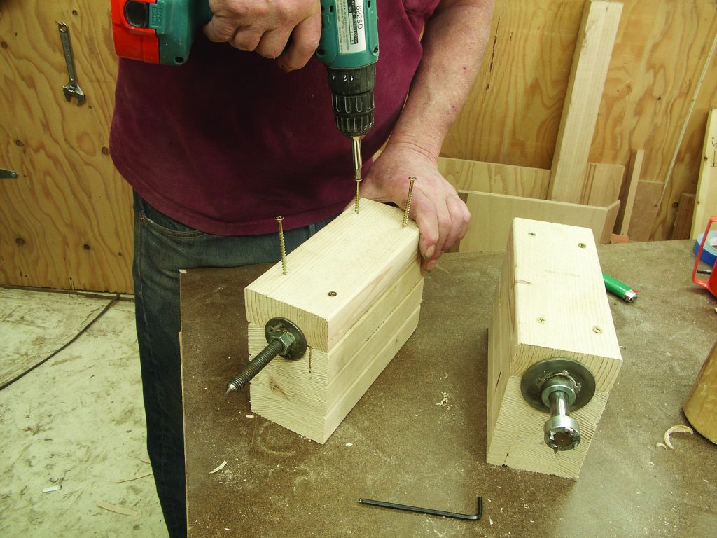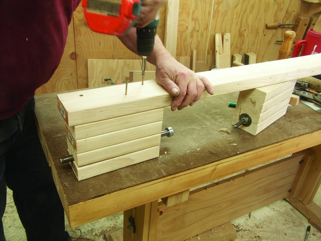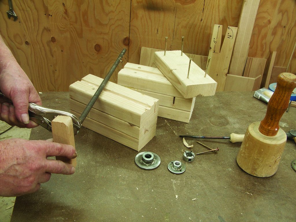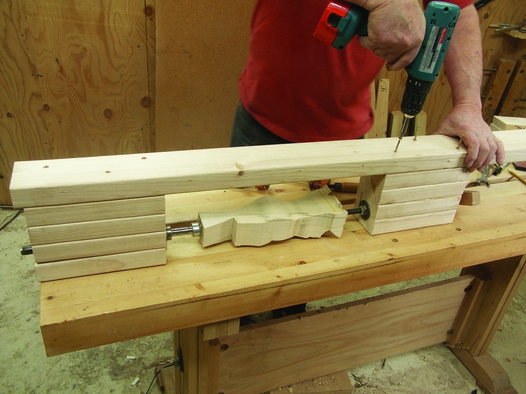 12. Mount your spur bearing to the end of a length of 2 x 4. Use the 21⁄2″-long drywall screws. The 2 x 4 should be about 30″ longer than the longest project you intend to carve. Mount the point bearing in such a position that the end-to-end of the shafts will accommodate your project. Clamp the vise to your bench, and you’re ready to work.