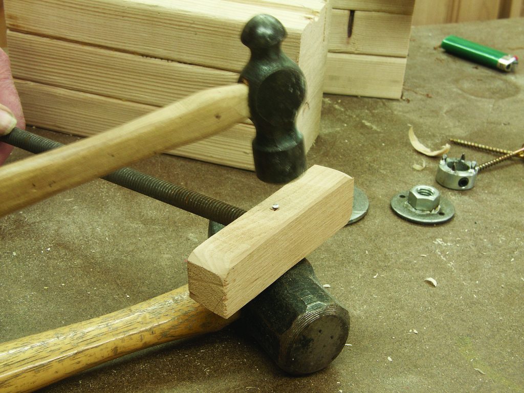 7. Prepare your handle. Drill a 7⁄16″-diameter hole almost through a piece of scrap that measures 11⁄2″ x 4”—feel free to whittle or carve the wood for comfort. Swab the hole with carpenters’ glue, and screw in a piece of 1⁄2″-diameter by 123⁄4″-long all-thread.