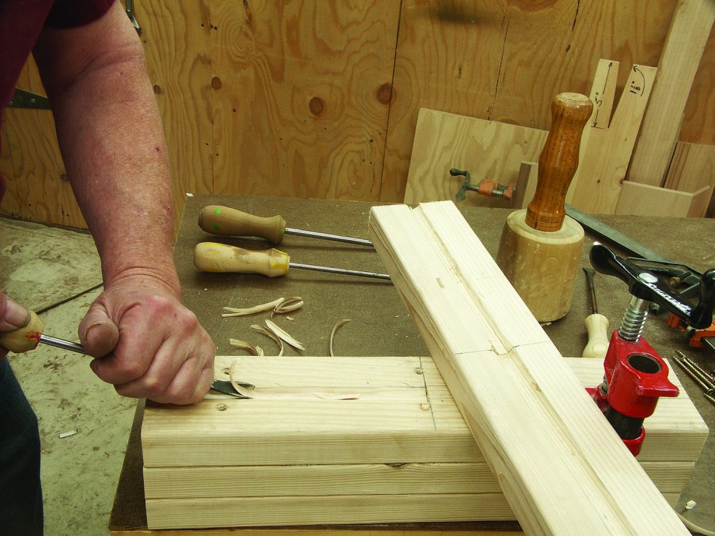 10. Prepare the bearing block. Mark the center of your 2 x 4 assembly. Lay out lines for cutting a 5⁄8″-wide channel in one-half of the assembly and a 1⁄2″-wide channel in the other half. Do likewise with an 18″ length of 2 x 4. With the appropriate size of gouge, carve half-round channels in both assemblies and the 2 x 4. This will provide a bore for your spur and point shafts. After carving, cut both the assembly and 2 x 4 in half—I use a band saw. This cut should be made as square as possible, for one surface will engage the friction washer. If the surface is not square with the shaft, it will cause uneven pressure on the friction washer and break the solder joint.