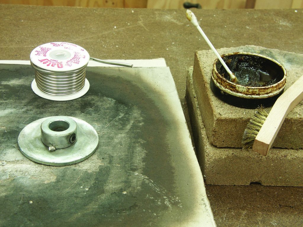 CAUTION: All soldering should be carried out in a well-ventilated area. In no way should the galvanized components become discolored, indicating too much heat. This means the galvanizing zinc is burning and releasing harmful fumes. Remember, you are working with very hot items that can cause burns if handled.  Also, this is a “safety glasses” operation.
