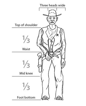 Body Proportions• Divide the body, below the head, into three equal sections: the shoulders to the waist, the waist to mid-knee, and mid-knee to the bottom of the feet. • Use the width of the head to determine the correct width of the body. At the shoulders, the body is three heads wide. |