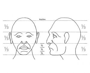 Head Proportions• Divide the head into three equal sections: the hairline to the eyebrows, the eyebrows to the bottom of the nose, and the bottom of the nose to the bottom of the chin. • Position the ears in the center section. The ears sit on the back half of head and are the same length as the center section—from the eyebrows to the bottom of the nose. • The bottom section, between the nose and the chin is further divided into three equal sections: the nose to the upper lip, the upper lip to the indention between the bottom lip and the chin, and the indention to the bottom of the chin. |
