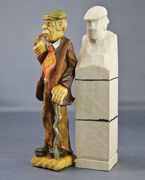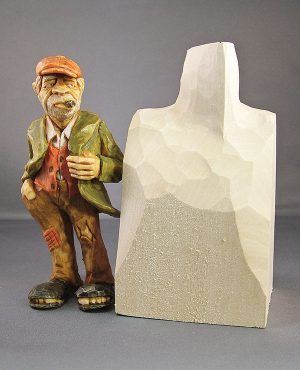 I carve my figures out of a block of wood with square corners. This raw carving medium gives me more freedom and allows me to be creative, rather than being limited by a predetermined pattern or outline of the sawn-out blank or rough out. This freedom allows me to come up with a unique design. Carving from a patterned sawn-out blank or a rough out limits creativity. While exercising your creative freedom, it’s important to maintain proper proportions in your figure. While you are engaged in cutting down the block of wood to the basic shape and form of the subject, it is helpful to have guidelines for the basic proportions. Proportional guidelines, such as the rule of three, will help you create a well-balanced and proportioned figure carving.