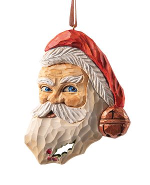 Paint the ornament using oil paints mixed with natural stain, such as Minwax®. I used thin washes for most of the carving, and applied heavier coats on the eyes, bell, and holly. Once dry, spray three thin coats of satin finish, such as Deft®. Then apply three thin coats of varnish, such as Jo Sonja®, to the eyes to give them a twinkle. Thread a string or ribbon through the screw eye and hang to display.