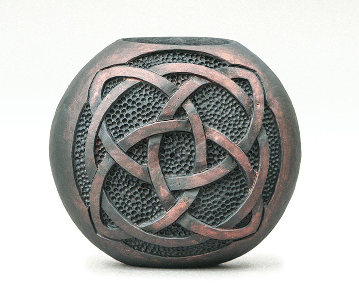 Metallic pigment over dark paint creates an illusion of antiquity for this folkloric vessel