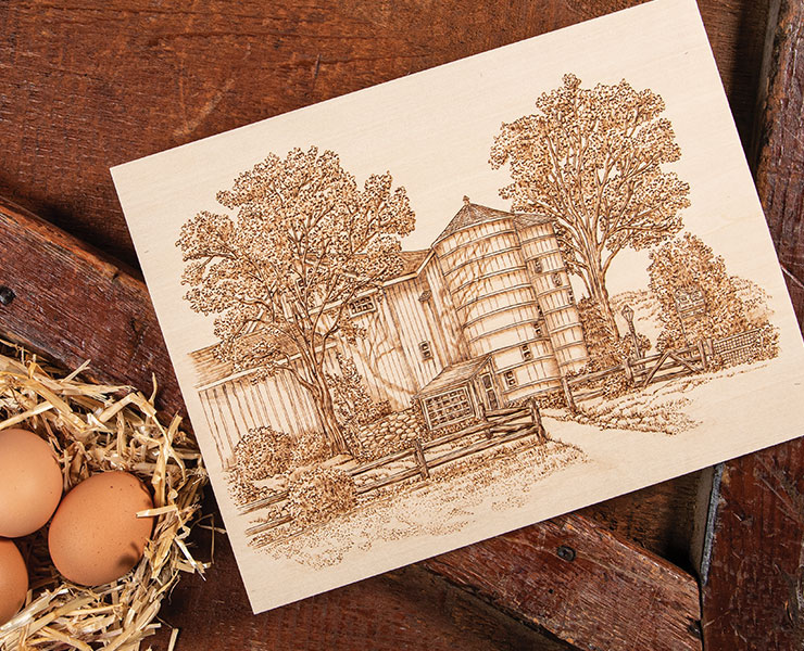 Extra Design – Discover an extra pyrography pattern of a house and barn from Carol Wallace.